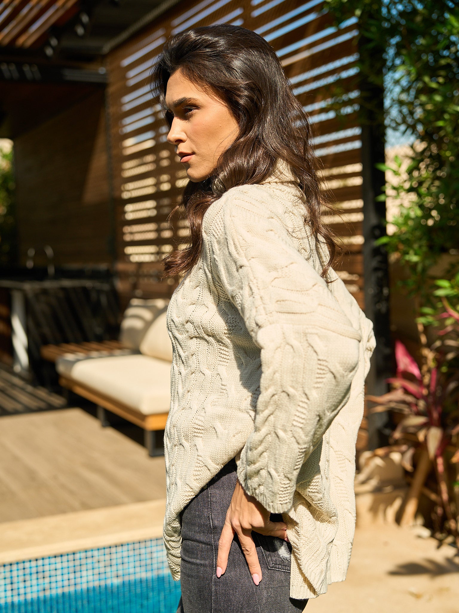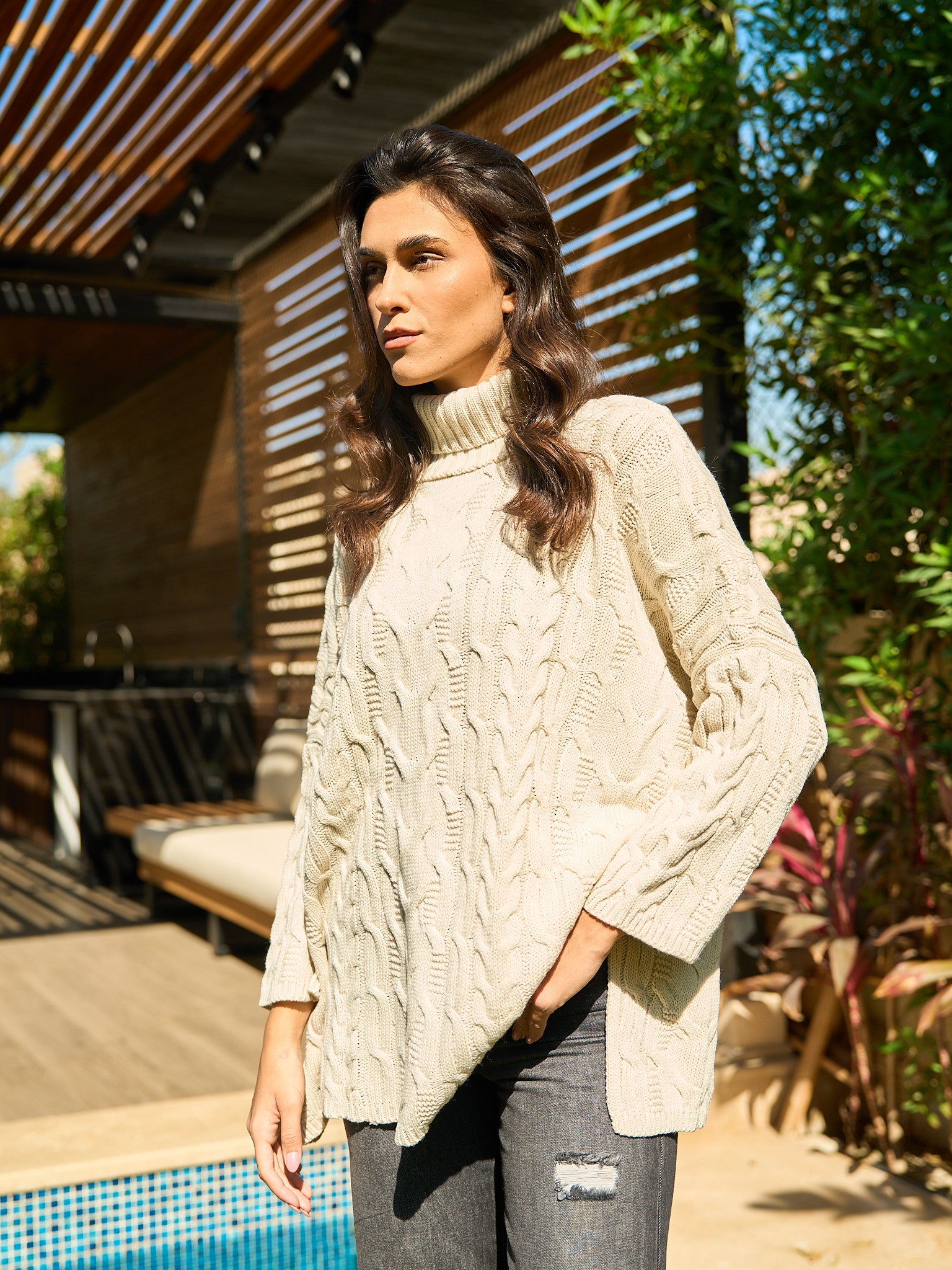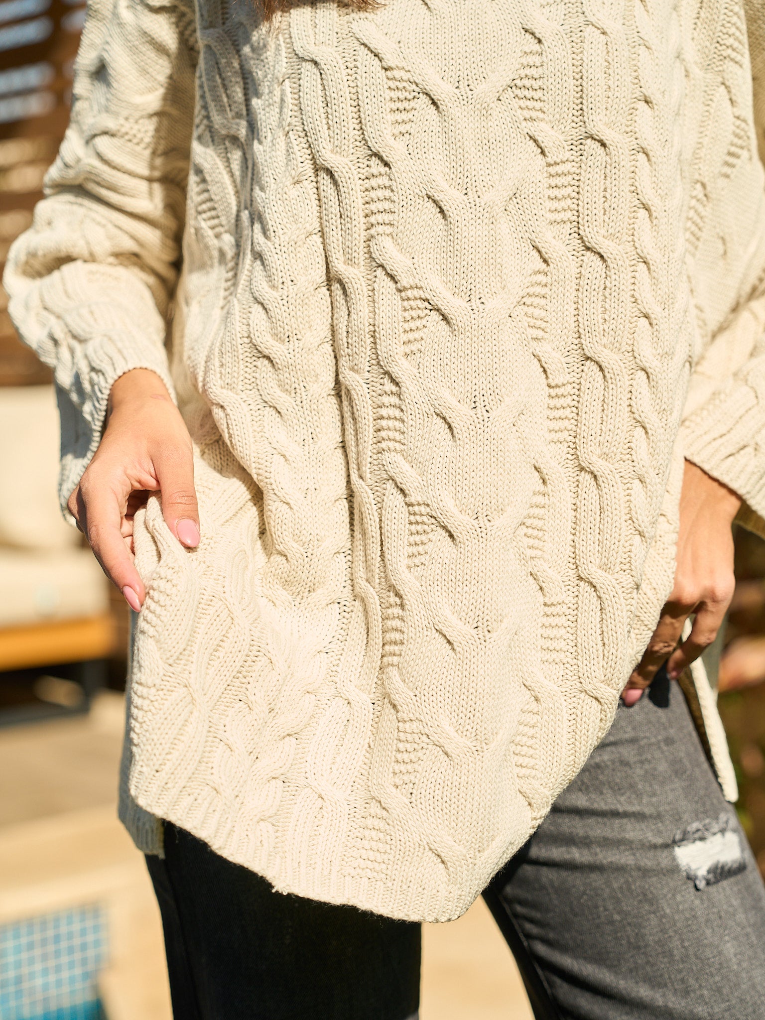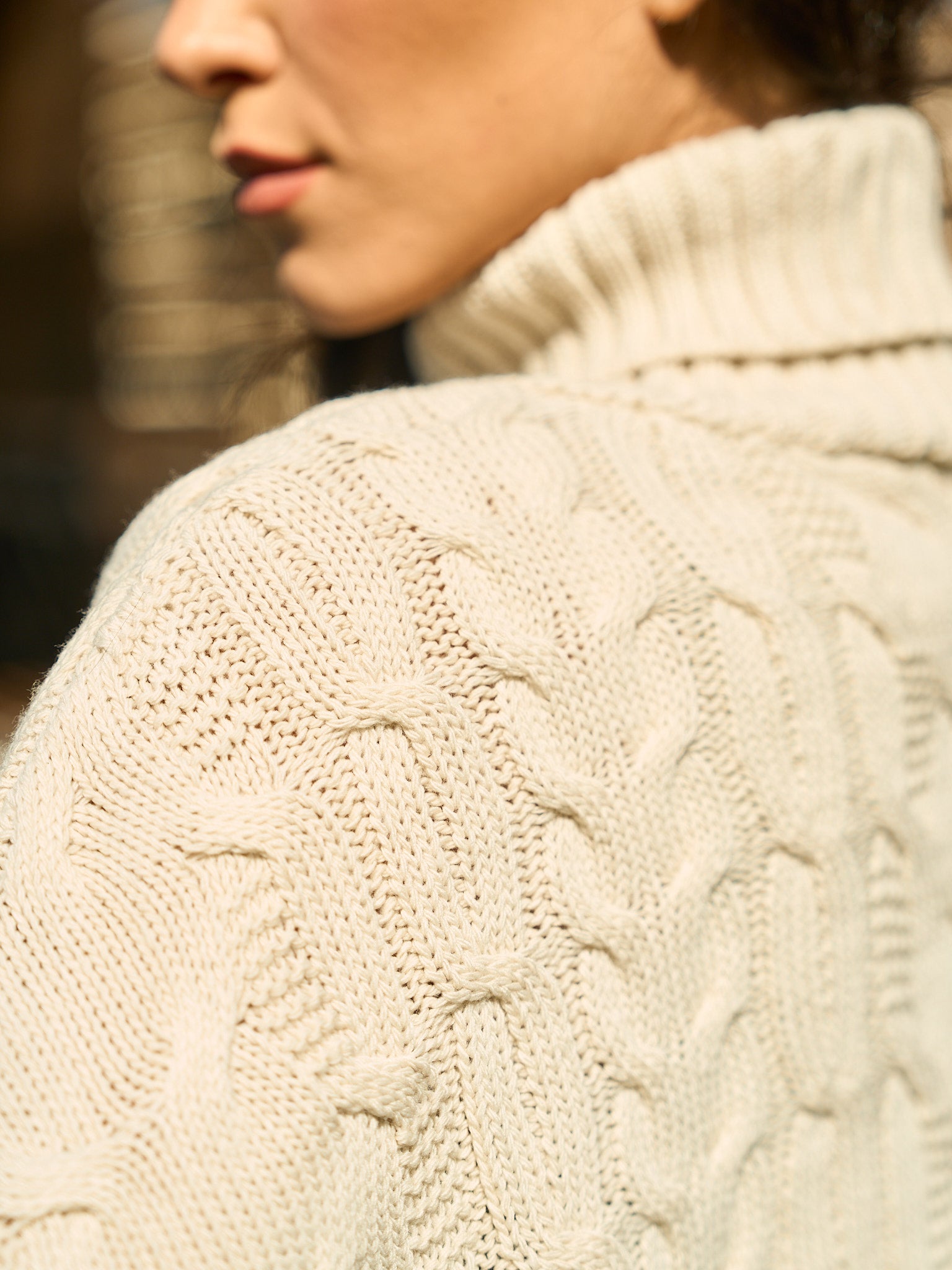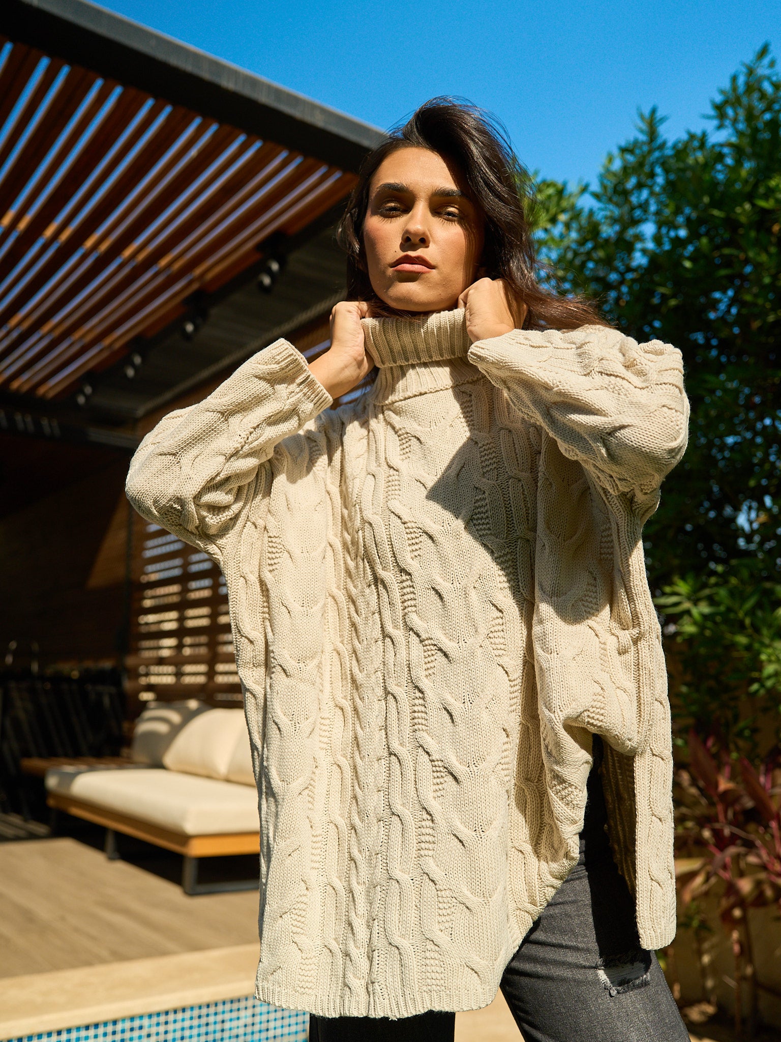 This piece beautifully merges classic British style with a contemporary edge, Crafted in an unmistakable Beige , with a cozy chunky cable knit for rich texture and warmth. The oversized, relaxed fit and snug turtleneck offer luxurious comfort, ensuring you stay effortlessly chic and perfectly warm all season long.